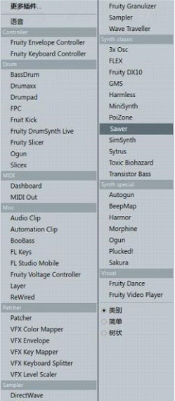 2.在通道机架窗口的最下方,点击“+”号按钮,在弹出的选项页面选择一个音色插件,这里选择“Sawer”音色插件。