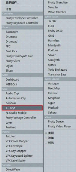 4.同样在通道机架窗口的最下方,点击“+”号按钮,在弹出的选项页面选择一个音色插件,这里选择“FL Keys”音色插件。
