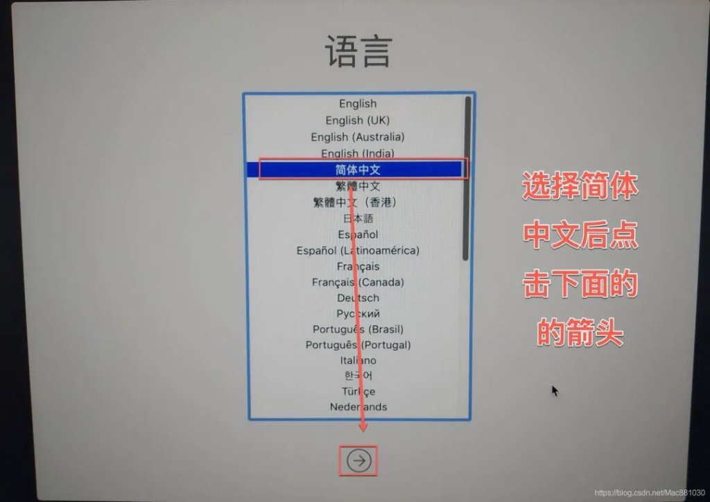 2、进入Recovery模式,选「简体中文」,然后按下面的箭头,如图所示:(有的系统没有此步骤可忽略)