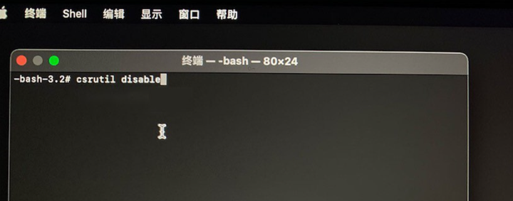 4、在终端调配窗口中输入【csrutil disable】命令,并通过回车键执行(注意两者之间包含空格)。
