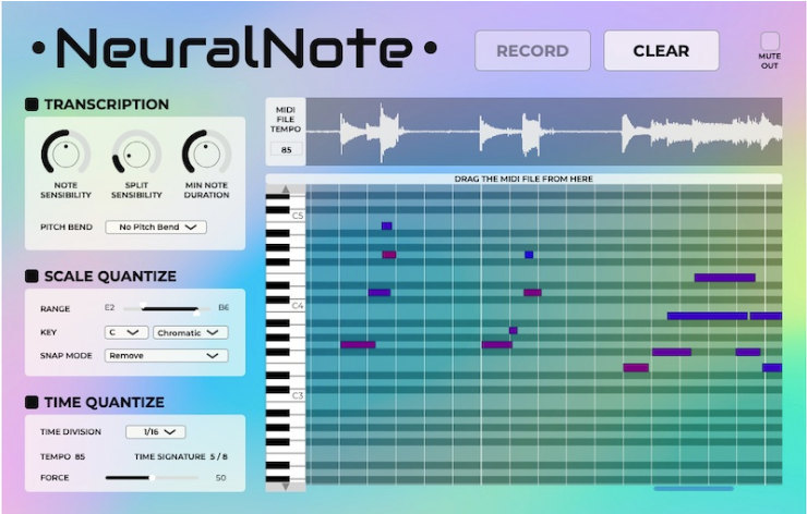 NeuralNote 是一款音频插件,它将最先进的音频转 MIDI 功能带入你最喜欢的数字音频工作站。适用于任何音调乐器(包括人声)。支持复音转录。支持音高弯曲检测。轻量级且转录速度非常快。允许在收听转录时调整参数。允许直接在插件中对转录的 MIDI 进行缩放和时间量化。NeuralNote 以一个简单的 AudioFX 插件(VST3/AU/独立应用程序)的形式出现,可应用于要转录的音轨上。工作流程非常简单:收集一些音频。点击录制。在实际录制时或在数字音频工作站中播放音轨时都能工作。或者将音频文件拖放到插件上。