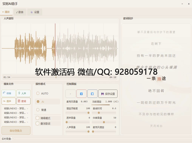 实时AI翻唱4.0专业版 SVC助手ai实时修音 悬浮歌词功能 音频播放器软件YU158.COM25年9月13日 20:41更新关注私信33813 软件概览 1.Ai实时翻唱4.0版本,音质提升超大 2.带悬浮歌词,软件嵌入歌词下载 3.Auto模式:你唱ai就唱,你停ai就停,你声音 大ai声音就大,你声音小ai声音就小 4.ai模式:不用你唱Ai自己全程唱 5.普通模式:伴奏不断,直接说话 6.清唱模式:伴奏停掉,清唱 auto和ai模式都可以 整合包下载 下载 © 版权声明 1. 本站为非营利性个人网站,所有资源来自网络收集整理,不对其内容和真实性负责,不提供安装指导; 2. 若您需要长期使用软件(资源),或者商业运营用于其他商业活动,请您购买支持正版授权并合法使用; 3. 若有内容侵犯到您的合法权益,请联系我们或发邮件到:928059178@qq.com,我们将删除处理,敬请谅解; 4. 本站所有资源内容,版权归原著所有,仅供个人学习测试,不存在任何商业目的与用途,请下载后24小时内删除; 5. 禁止下载使用本站资源参与商业和非法行为,如用户未及时删除资源引起的版权纠纷,本站不承担任何法律责任; THE ENDRVC AI翻唱精调效果包调试教程调音工具 点赞13 分享QQ空间微博QQ好友海报分享复制链接收藏