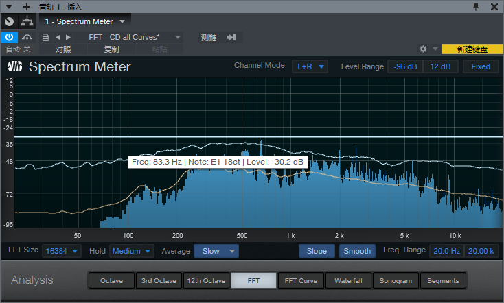 除了选择“预设”模式外,我们可根据实际需要来选择频谱仪的模式。在频谱仪效果器“Analysis”位置直接点击选择模式,如FFT,则表示为全部曲线模式。播放音频文件时,效果器窗口则有频谱波动。需要频谱参数时,鼠标置于窗口内便可显示水平方向及垂直方向上的各种参数。根据此数据,作为参考,便于乐曲工程的制作。