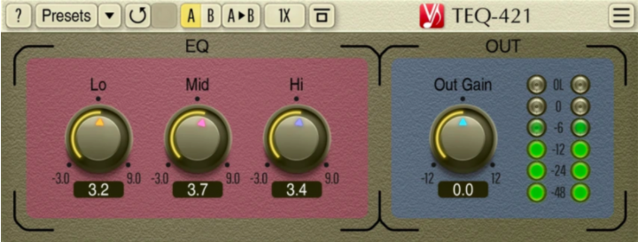TEQ-421是免费的AAX、AudioUnit和VST插件,用于专业音乐制作应用。这个均衡器只有三个频段(Triple EQ),经过微调,在很多情况下都能提供良好的效果,因此非常容易使用。此外,该插件具有内部非参数谐波着色模块(源自HarmoniEQ插件),产生平滑的饱和度和 "存在 "效果。
