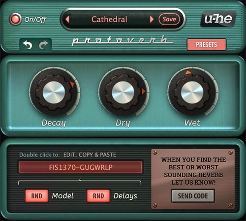 Protoverb 界面底部的文本框包含一个由两个随机部分组成的文本字符串. 前半部分规定了网络结构、延迟抽头的空间布局和分布策略、寻找有用延迟长度的策略等。后半部分是伪随机数生成器的种子——用于设置各种参数,例如平均延迟长度、选择哪个素数(如果有)等。